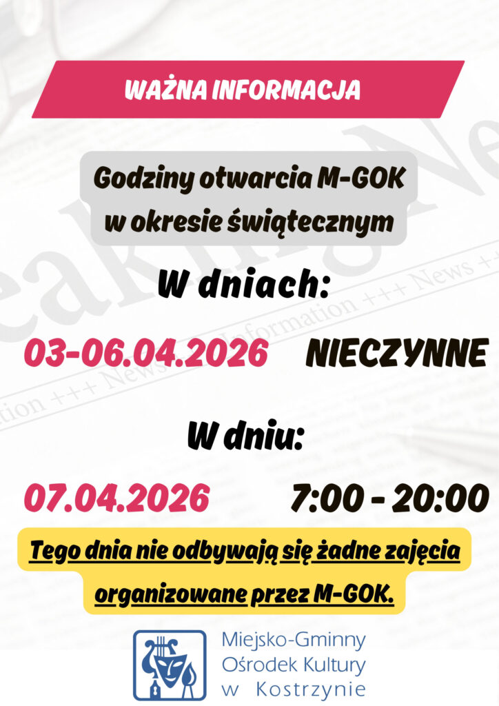 Z okazji zbliżających się Świąt Wielkanocnych, informujemy o zmianach w godzinach otwarcia. Oto szczegółowy plan pracy Ośrodka: 03 – 06